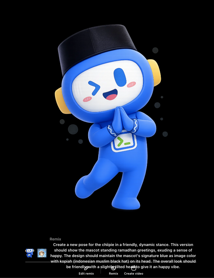 Create a new pose for the chiipie in a friendly, dynamic stance. This version should show the mascot standing ramadhan greetings, exuding a sense of happy. The design should maintain the mascot's signature blue as image color with kopiah (indonesian muslim hat) on its head. The overall look should be friendly, with a slightly tilted head to give it an happy vibe. - Result: